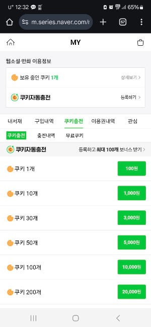 결제 수단(신용카드, 계좌이체, 네이버페이 등)을 선택하고 결제를 진행하면 끝! 충전된 쿠키는 모바일 앱에서도 동일하게 사용할 수 있으니, 충전 후 다시 앱으로 돌아가 웹툰이나 웹소설을 마음껏 즐기세요. 쿠키 충전 내역은 '내 정보' → '결제 내역'에서 확인 가능합니다.