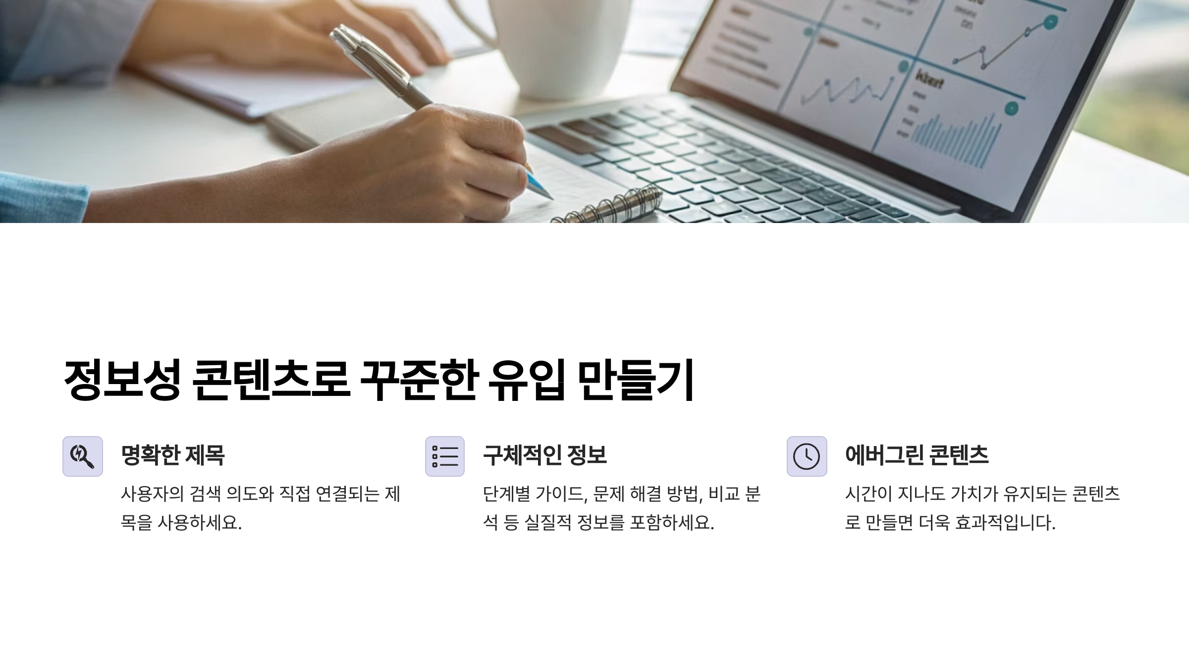 또한 정보성 콘텐츠는 시간이 지나도 가치가 유지되는 '에버그린 콘텐츠'로 만들면 더욱 효과적입니다. 한 번 작성해두면 몇 개월, 때로는 몇 년 동안 꾸준히 블로그 트래픽을 발생시키는 자산이 됩니다. 이런 콘텐츠는 초기에 시간과 노력이 많이 들어가지만, 장기적으로 봤을 때 블로그 트래픽 증가에 큰 기여를 합니다.