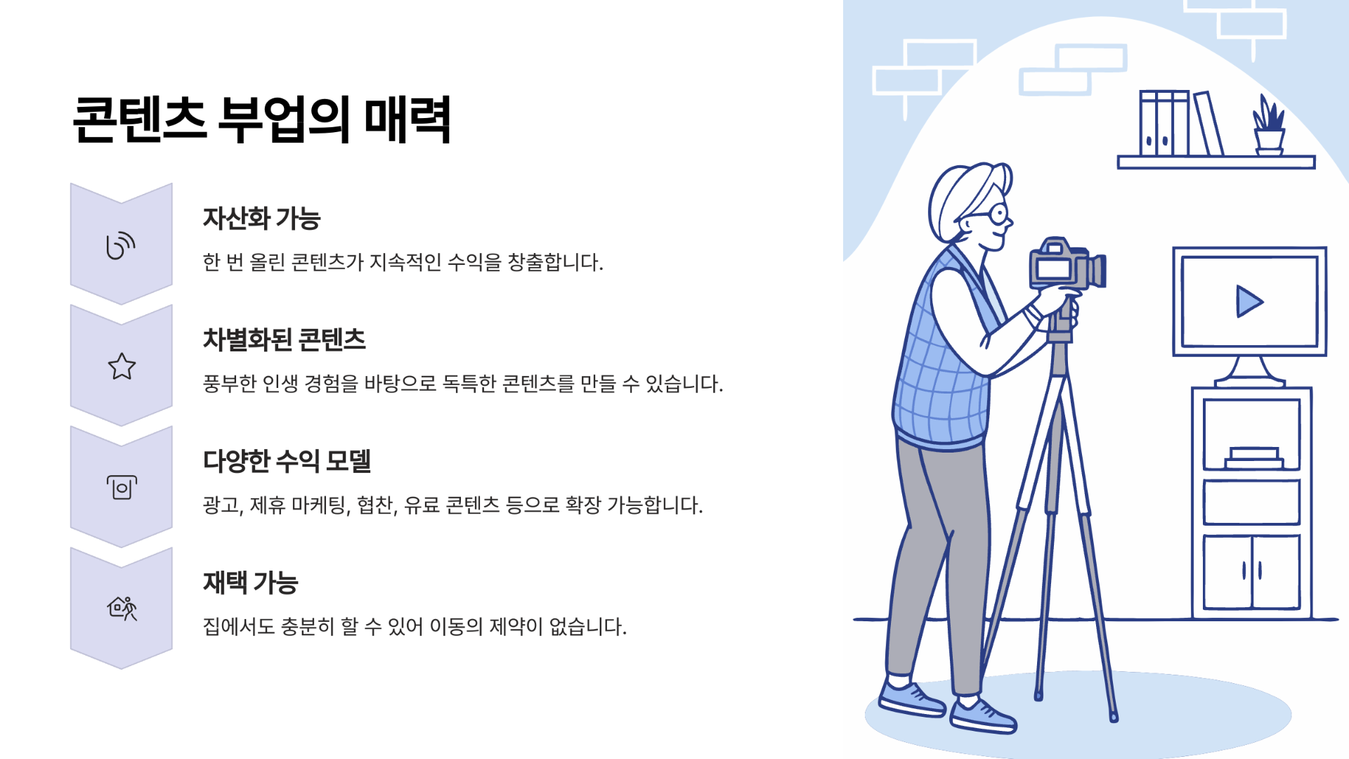 콘텐츠 부업의 가장 큰 장점은 시간이 지날수록 자산화된다는 점입니다. 블로그 글이나 유튜브 영상은 한 번 올려두면 지속적으로 조회수를 발생시키고, 이는 꾸준한 수익으로 이어집니다. 특히 시니어 분들의 경우, 젊은 세대에게는 없는 풍부한 인생 경험을 콘텐츠로 풀어낼 수 있어 차별화된 매력을 가질 수 있어요.