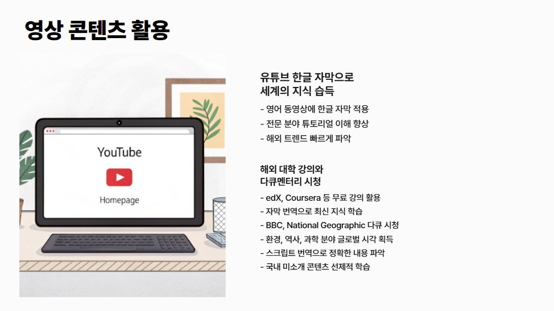 오늘 소개한 방법들 중 하나라도 시도해 보세요. 해외 현지 정보로 더 특별한 여행을 계획하거나, 영어 유튜브 채널을 구독해 새로운 지식을 얻거나, 전 세계의 제품과 서비스를 탐색해 보세요. 언어의 장벽을 넘어서면, 인터넷은 훨씬 더 넓고 풍요로운 세계가 됩니다.