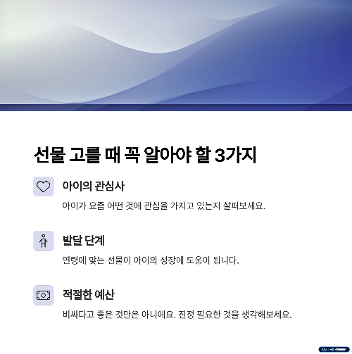 어린이날 선물을 고를 때 가장 중요한 것은 무엇일까요? 바로 '아이의 관심사'입니다. 아무리 좋은 선물이라도 아이가 관심 없는 분야의 선물이라면 그저 방 한구석에 놓여있을 뿐이죠. 그래서 선물을 고르기 전에 아이가 요즘 어떤 것에 관심을 가지고 있는지 살펴보는 것이 중요해요. 또 하나 고려해야 할 점은 아이의 발달 단계입니다. 3-5세 유아는 감각 발달과 호기심 자극 위주의 선물이, 초등학생은 창의력과 사고력을 키울 수 있는 선물이 적합하죠. 예산도 중요한 고려사항인데요, 비싸다고 좋은 것만은 아니니 아이에게 정말 필요한 선물이 무엇인지 생각해보세요. 당신은 아이의 특성을 가장 잘 알고 있는 사람이니, 그 관찰력을 믿고 선택하는 것이 중요합니다.
